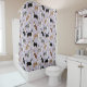 Cute Australian Shepherds / Aussie dogs in black, brown and merle coats sit and stand scattered dog bones and paw prints on a light purple background.