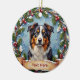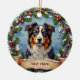 A beautiful, ultra-detailed Christmas ornament design featuring a realistic portrait of the breed centered within a soft, festive winter frame. This elegant design includes pine branches, red berries, and snowflakes against a snowy backdrop, illuminated by warm holiday lighting. The balanced, round composition includes clear space below the dog for customization.