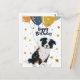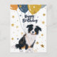A cute Australian Shepherd with birthday balloons wishes Happy Birthday