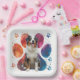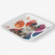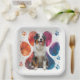 A cheerful Australian Shepherd dog sits in front of colourful paw print designs, showcasing a vibrant mix of red, purple, and blue hues