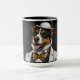 Australian shepherd dog in three-piece suit and white melon hat. Fun pet.