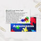 Business sized card with some basic info about ASD "Autism is a complex neurological disorder...." "These tantrums can be frightening to witness. The child attempts to communicate......" Reverse of card has image of falling puzzle pieces against a backlit blue background. These cards can nome in handy when a parent is trying to manage the child's behaviour and gawkers are gathering and/or commenting.