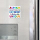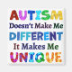 Inspirational quote of “AUTISM Doesn't Make Me DIFFERENT, It Makes Me UNIQUE” with colorful Autism puzzles to support and advocate Autism Awareness.