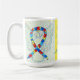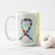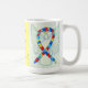 Autism uses a puzzle awareness ribbon to show support for its awareness. This custom mug features puzzle awareness ribbon guardian angel art paintings with the message "I Hope and Support Autism Awareness!" The custom puzzle awareness guardian angel ribbon art picture coffee cups or mugs can be customised with personalised messages to make great cause mugs for awareness fundraisers, awareness cup gifts, or other special events or cause support occasions. Make your own customised words for a personal message of hope and support to share!