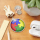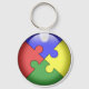 Promote Autism Awareness. Red, yellow, blue and green puzzle pieces form a colourful pinwheel in the middle of this bold design. It looks great on buttons, t-shirts and more.