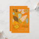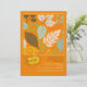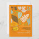 A bright and happy autumn-leaf invitation featuring leaves in white, blue, yellow, green and brown against an orange background. (Vecteezy.com - Fall and Autumn Card Vector Templates by happymeluv). The card is easy to customise with your wording, font, font colour, paper shape options and choice of six paper types.