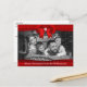 A modern photo Christmas card design with your family photo made black and white and filling the card face. Christmas red ribbons frame your photo with your words below. You can personalise the backside Christmas greeting, your return address and your names in script near the bottom with space for you to add a handwritten personal note.