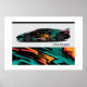Poster shown with a photo print of a sleek race sports car.