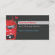 A smart looking auto service business card with red sports car with business name, service and tagline on black background with red, white and blue text. Back has white background with red and dark grey text with QR code and contact info.