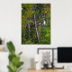 Two white aspen trunks stand out dramatically in front of a forest full of lovely autumn colours of yellow, orange, red and green.