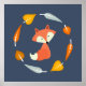 Adorable nursery print features a sweet vector illustration of a baby red fox inside a round wreath made of leaves in beautiful yellow, orange, and blue fall hues.