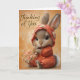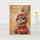 This beautifully tender “Thinking of You” card features a baby bunny dressed in an orange autumn romper and bonnet, holding a bouquet of soft peach blossoms. With her shy, heartwarming expression and warm amber backdrop, this card is perfect for offering comfort, support, or a sweet reminder that someone is in your thoughts. A gentle, soulful design ideal for any caring occasion.