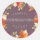 Add a festive touch to your Friendsgiving dinner invitations and more with our round Thanksgiving stickers featuring "Happy Friendsgiving" and the year in white on a deep plum background, surrounded by watercolor autumn leaves in rich fall colours.