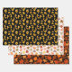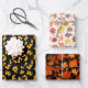 This collection of wrapping paper sheets features three autumnal themed patterns - candy corn pattern on black - "I love fall" typography between maple, oak, chestnut leaves pattern - maples leaves and pumpkins pattern on black - by katz_d_zynes