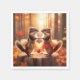 Two chipmunks wearing tutu skirts dancing on a tree stump holding paws surrounded by falling autumn leaves