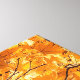 A vibrant image captures the beauty of autumn with a close-up view of a tree branch laden with golden yellow leaves. The leaves, with their intricate veins and delicate shapes, create a stunning contrast against the clear blue sky peeking through. The branches extend towards a tall, beige building with large windows, hinting at the urban setting.
