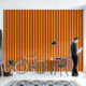 This wallpaper features vertical stripes in varying widths in Autumn colours with stripes of gold, brownish orange and maroon.