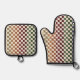 Retro Pot Holder Design | Burgundies, greens and earth tone colours are combined in a woven like pattern for a modern twist on a retro style design. The design is reminiscent of the old loom woven cotton loop pot holders that were (and still are) a popular hobby. Pot holder and oven mitt can be purchased as a set or each can be purchased separately, allowing you to mix and max styles if you desire. Choose quilted silver or black silicone for heat protection.