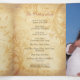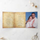 Autumn fall vintage maple leaves tri-fold wedding program with personalised photo template. Elegant tri-fold wedding program design that features a beautiful vintage illustration of fall maples leaves. It is autumn colours of burnt orange, harvest yellow, beige and brown. The background is an aged parchment paper look. You can personalise all the wording and the engagement or couple photo on the inside panel. This program has lots of room to add additional wording as well. You may have to go into the customise section to change the placement of the wording or the font sizes. There are layers for each of the different panels.