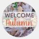 Customisable "Welcome autumn" Stickers with a beautiful picture of fallen leaves with tiny yellow mushrooms.