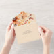 Your wedding day is a celebration of love, joy, and the beauty of nature's autumn treasures. This All-in-One wedding invitation showcases the radiant charm of flowers and with delicate leaves in warm autumn colours on a tan background, creating an invitation that embodies warmth, happiness, and casual elegance. The All-in-One wedding invitations are both beautiful and practical by combining the wedding invitation with an easy to remove perforated RSVP postcard. They are also quick and easy to prepare for mailing. Simply address the invitation, fold the back flap and seal with the included clear stickers. Once your guests receive the pre-addressed invitation they simply tear off the perforated RSVP card and drop it in the mail. The addition of the QR code allows your guests to easily access your wedding website for information including reception details and dinner choices!