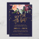 This autumn floral we tied the knot elopement reception card is perfect for a fall post elopement party. The design features a stunning bouquet of blush, orange peach, and marsala burgundy flowers with faux gold foil typography and confetti. The backing features a coordinating flower arrangement with gorgeous wedding typography. RSVP cards are sold separately.