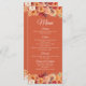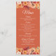 Autumn Floral Menu. Set against a rust orange background, this wedding menu features watercolor painted flowers in the perfect autumn colours of orange, blush, yellow, red, and pink with gold foil accents. This is perfect for classic, contemporary, and vintage wedding styles for the autumn season. Browse the selection of coordinating invitations, RSVP cards, signs, and more.