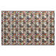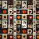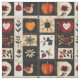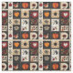 This fabric features a folk art patchwork quilt style, arranged in a grid of autumnal and nature-inspired motifs. Prominent elements include orange pumpkins, stylised flowers, vine patterns, a red heart with cream outline, and a polka-dotted bird, all set within contrasting blocks of black, cream, and warm earthy tones like orange, red, and brown. The varied textures suggest appliqué, embroidery, or traditional quilting techniques, giving the design a homespun, handcrafted feel. Perfect for fall décor, rustic farmhouse style, Thanksgiving crafts, and primitive folk art lovers, this pattern blends cosy charm with seasonal elegance.
