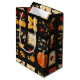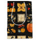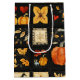 This gift bag showcases a folk art quilt-style patchwork, filled with rustic and autumnal motifs. Arranged in a grid of squares and rectangles, it features pumpkins, falling leaves, birds, hearts, and stars, all rendered in a cosy primitive style. The warm earthy colour palette of orange, brown, gold, black, red, and cream creates a harvest-inspired aesthetic perfect for autumn, Thanksgiving, farmhouse décor, and country living. With visible stitching details and a homespun charm, this pattern embodies the traditional, handmade look of rustic quilting while celebrating the season’s bounty.
