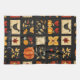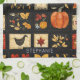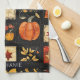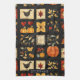 This kitchen towel showcases a folk art quilt-style patchwork, filled with rustic and autumnal motifs. Arranged in a grid of squares and rectangles, it features pumpkins, falling leaves, birds, hearts, and stars, all rendered in a cosy primitive style. The warm earthy colour palette of orange, brown, gold, black, red, and cream creates a harvest-inspired aesthetic perfect for autumn, Thanksgiving, farmhouse décor, and country living. With visible stitching details and a homespun charm, this pattern embodies the traditional, handmade look of rustic quilting while celebrating the season’s bounty.