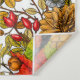 Hand-drawn autumn pattern featuring bullfinches, dahlia and chrysanthemum flowers, various berries, leaves and bugs