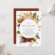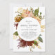 A lovely rustic bridal shower invitation featuring text in a white circle surrounded by a watercolor floral bouquet in autumn shades of paprika, orange, burgundy, brown, gold, pink, peach, rust, ivory, and cream. The reverse side is a matching shade of deep burgundy. Ideal for a fall or winter wedding. See our Autumn Garden Rustic Floral wedding collection for coordinating designs.