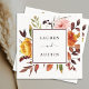 This wedding napkin features yellow, blush pink, orange watercolor flowers, and green, burgundy, brown leaves with a square frame. It’s perfect for a fall (autumn) wedding or similar events.