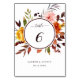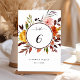 This wedding table number features yellow, blush pink, orange watercolor flowers, and green, burgundy, brown leaves with a circle frame. It’s perfect for a fall (autumn) wedding or similar events.