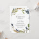 This autumn greenery engagement party invitation is perfect for a fall engagement event. The modern rustic design features navy blue, sage green and gold leaves with sprigs of dark blue flowers.