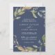 This autumn greenery navy formal wedding invitation is perfect for a fall wedding. The modern rustic design features navy blue, sage green and gold leaves with sprigs of dark blue flowers.