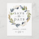 This autumn greenery save the date postcard is perfect for a fall wedding. The modern rustic design features navy blue, sage green and gold leaves with sprigs of dark blue flowers.
