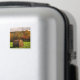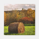 This fine art photography magnet presents a lovely autumn landscape in seasonal fall foliage colours of red, orange, yellow, brown and green. A storm has passed and the sun is breaking through the clouds onto a mown field with round bales of hay.