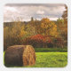 These fine art photography stickers presents a lovely autumn landscape in seasonal fall foliage colours of red, orange, yellow, brown and green. A storm has passed and the sun is breaking through the clouds onto a mown field with round bales of hay.