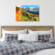 Canvas landscape print of a church and the village St. Magdalena in Villnoess in a fairy tale landscape with majestic Dolomites mountains in the background and leaves in autumn colours in Val di Funes valley in Italy. Great decoration on your wall!