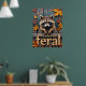 This charming painting features a racoon with detailed brown and white fur and a curious expression, perched on a weathered wooden picket fence. Bright yellow and orange autumn leaves are scattered around the fence and drift down from above. The text "Cute but FERAL" is boldly displayed in white and orange letters on the fence itself.