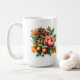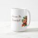 Coffee mug is shown with a lovely autumn pinecone and acorns floral art print. Autumn Is Beautiful Text.