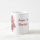 Coffee mug is shown with a lovely autumn pinecone and acorns floral art print. Autumn Is Beautiful Text.