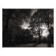 A warm toned black and white photo taken amongst the trees at Bute Park Cardiff on a sunny November afternoon the autumn sun low in the sky shines through the trees casting long shadows and dramatic silhouettes.