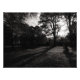A warm toned black and white photo taken amongst the trees at Bute Park Cardiff on a sunny November afternoon the autumn sun low in the sky shines through the trees casting long shadows and dramatic silhouettes.