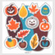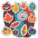 Vibrant autumn stickers featuring colorful maple and pumpkin shapes. Ideal for scrapbooks, gift tags, school projects, and seasonal crafts. Bright oranges, reds, greens capture fall vibes and cozy celebrations.