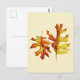 Autumn leaves postcard with an ink and watercolor illustration depicting two brownish yellow pin oak leaves. One of the leaves has a curled side which looks like a hand it gives to its dancing partner. This nature lover design has customisable background.