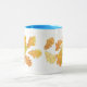 A white ringer mug with a powder blue rim and handle that complement the autumnal design of colourful oak leaves.