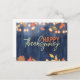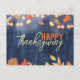 This customisable Thanksgiving postcard is the perfect way to send warm wishes to your loved ones. The blue wooden texture background is adorned with scattered orange and yellow leaves, creating a cosy and inviting atmosphere. The yellow cursive font adds an elegant touch to the “Happy Thanksgiving” message, while the string lights on top add a festive touch. This postcard is sure to bring a smile to anyone’s face and make them feel appreciated this holiday season. 🍁🦃