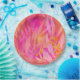 Brightly coloured leaves and botanical elements overlap in shades of pink, orange, and yellow against a vibrant background. The composition creates a warm, cheerful, and energetic atmosphere.